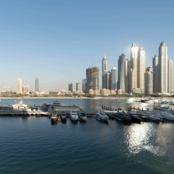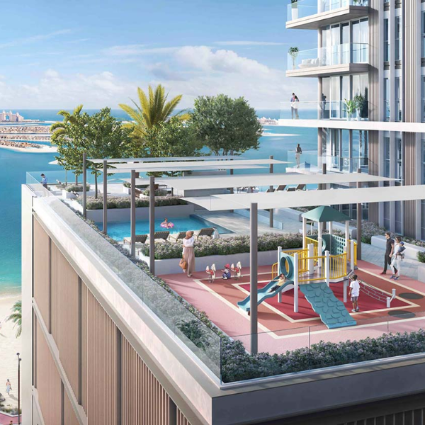 The residential tower is located between the Persian Gulf and skyscrapers in the Emaar Beachfront area. Residents will be able to enjoy picturesque views of the yacht marina and Palm Jumeirah Island through panoramic windows. The residences will feature designer furniture, finished with high-quality materials. Each unit will include walk-in closets, kitchens with appliances, balconies, spacious dining areas, and laundry rooms.